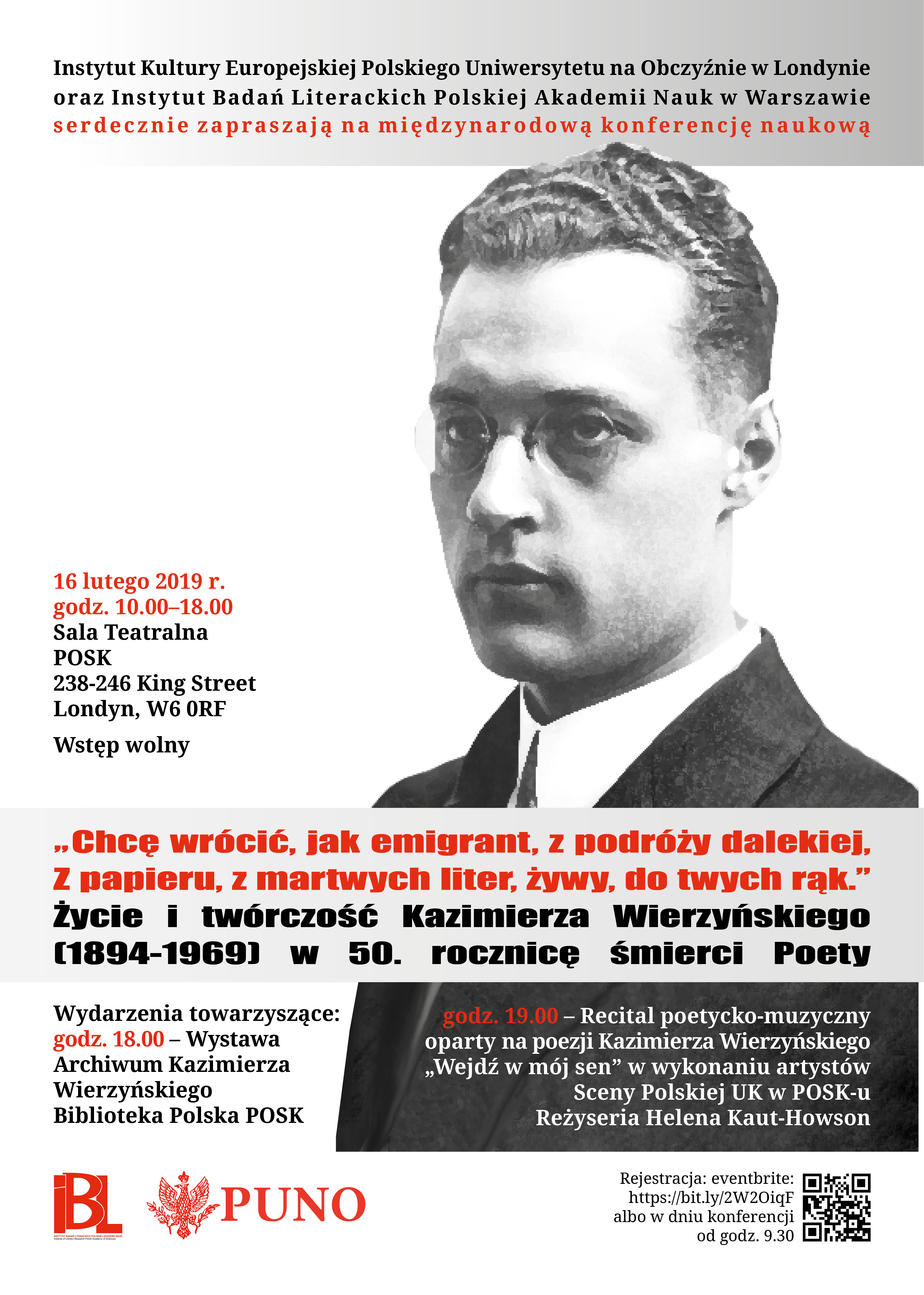 IBL PAN w Warszawie oraz IKE PUNO w Londynie serdecznie zapraszają na międzynarodową konferencję naukową poświęconą życiu i twórczości Kazimierza Wierzyńskiego w 50. rocznicę śmierci Poety.