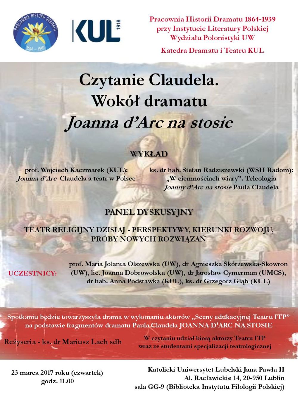 Katedra Dramatu i Teatru KUL oraz Pracownia Historii Dramatu 1864-1939 przy Instytucie Literatury Polskiej Wydziału Polonistyki UW zapraszają na spotkanie Czytanie Claudela. Wokół dramatu „Joanna d’Arc na stosie”, które odbędzie się 23 marca 2017 r. o godz. 11:00 w Bibliotece Instytutu Filologii Polskiej, Gmach Główny, sala GG-9.