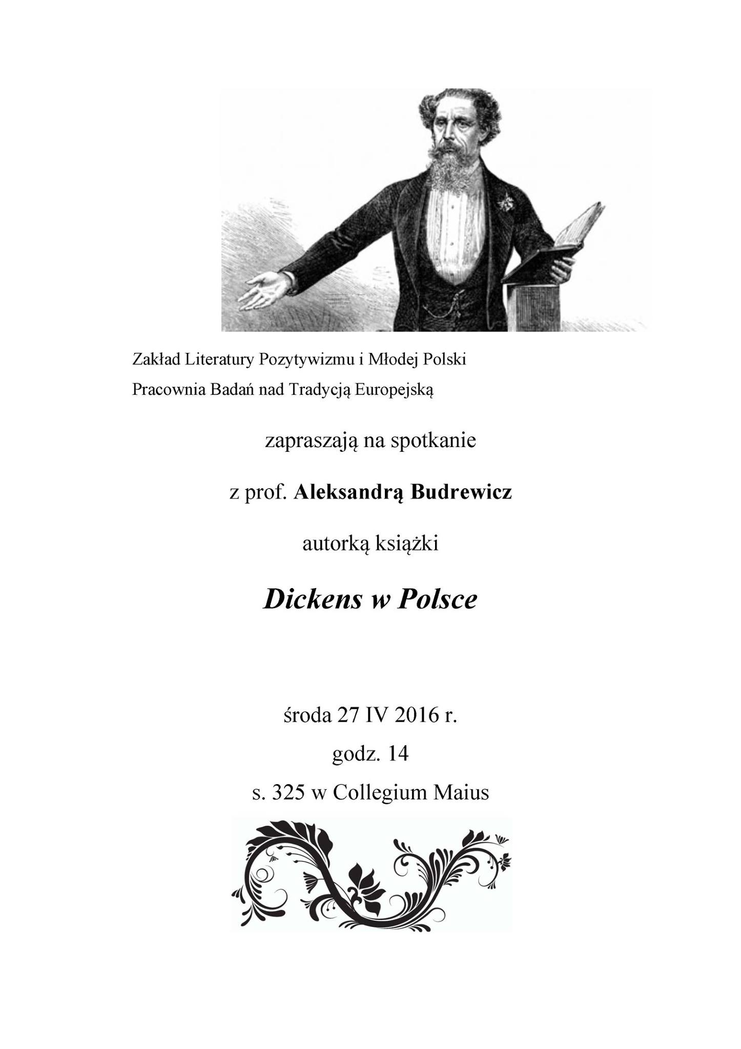 Zakład Literatury Pozytywizmu i Młodej Polski oraz Pracownia Badań nad Tradycją Europejską zapraszają na spotkanie z prof. Aleksandrą Budrewicz, autorką książki „Dickens w Polsce”. Spotkanie odbędzie się w środę 27 kwietnia 2016 r. o godz. 14.00 w sali 325 Collegium Maius.