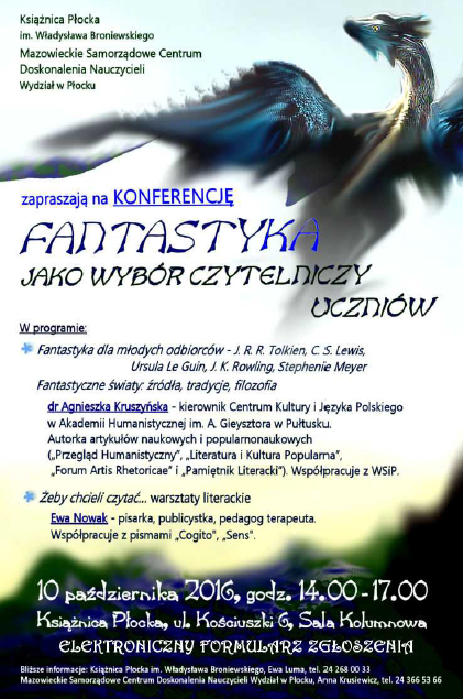 Instytut Filologii Polskiej Akademii im. Jana Długosza w Częstochowie wraz z Częstochowskim Stowarzyszeniem Miłośników Kultury, Literatury i Fantastyki "Salt Lake City" zapraszają na trzeci panel żywej konferencji Spotkania z Fantastyką pt. Karczma na rozstajach: Rola magii w literaturze fantastycznej. Na spotkanie zapraszamy wszystkich pasjonatów literatury fantastycznej, graczy oraz miłośników gier RPG i szeroko pojętego fandomu. Zgłoszenia do 10 kwietnia 2016.