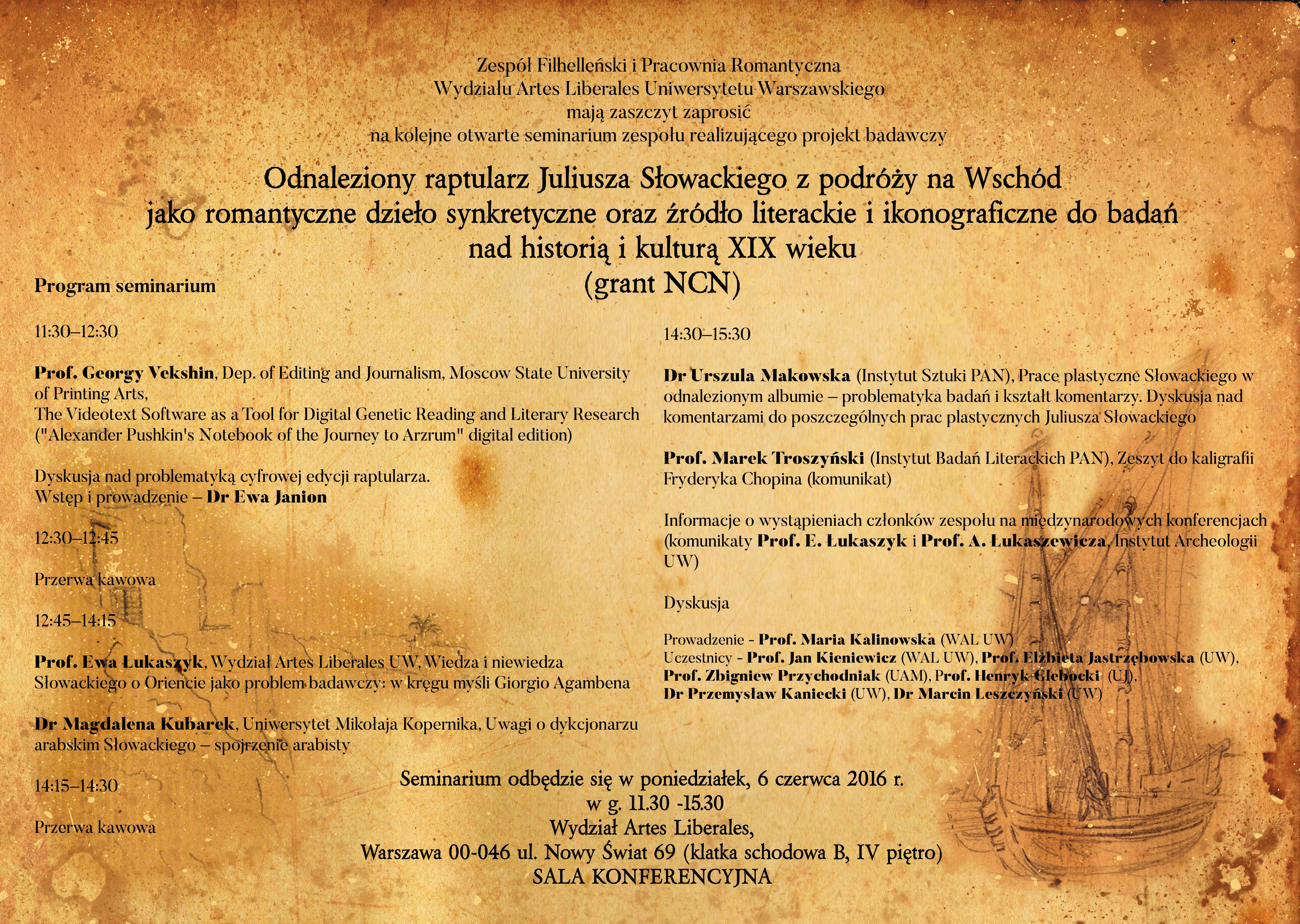 Zespół Filhelleński i Pracownia Romantyczna Wydziału Artes Liberales Uniwersytetu Warszawskiego mają zaszczyt zaprosić na kolejne seminarium zespołu realizującego grant NCN na opracowanie odnalezionego raptularza Juliusza Słowackiego z podróży na Wschód