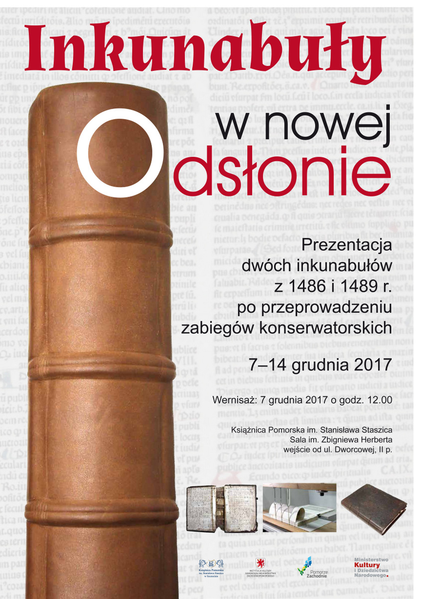 Książnica Pomorska zrealizowała zadanie finansowane ze środków Ministerstwa Kultury i Dziedzictwa Narodowego w ramach programu „Wspieranie działań muzealnych” oraz ze środków otrzymanych z budżetu Województwa Zachodniopomorskiego. Zadanie obejmowało konserwację dwóch inkunabułów - zabytkowych ksiąg w języku łacińskim pochodzących z XV wieku.