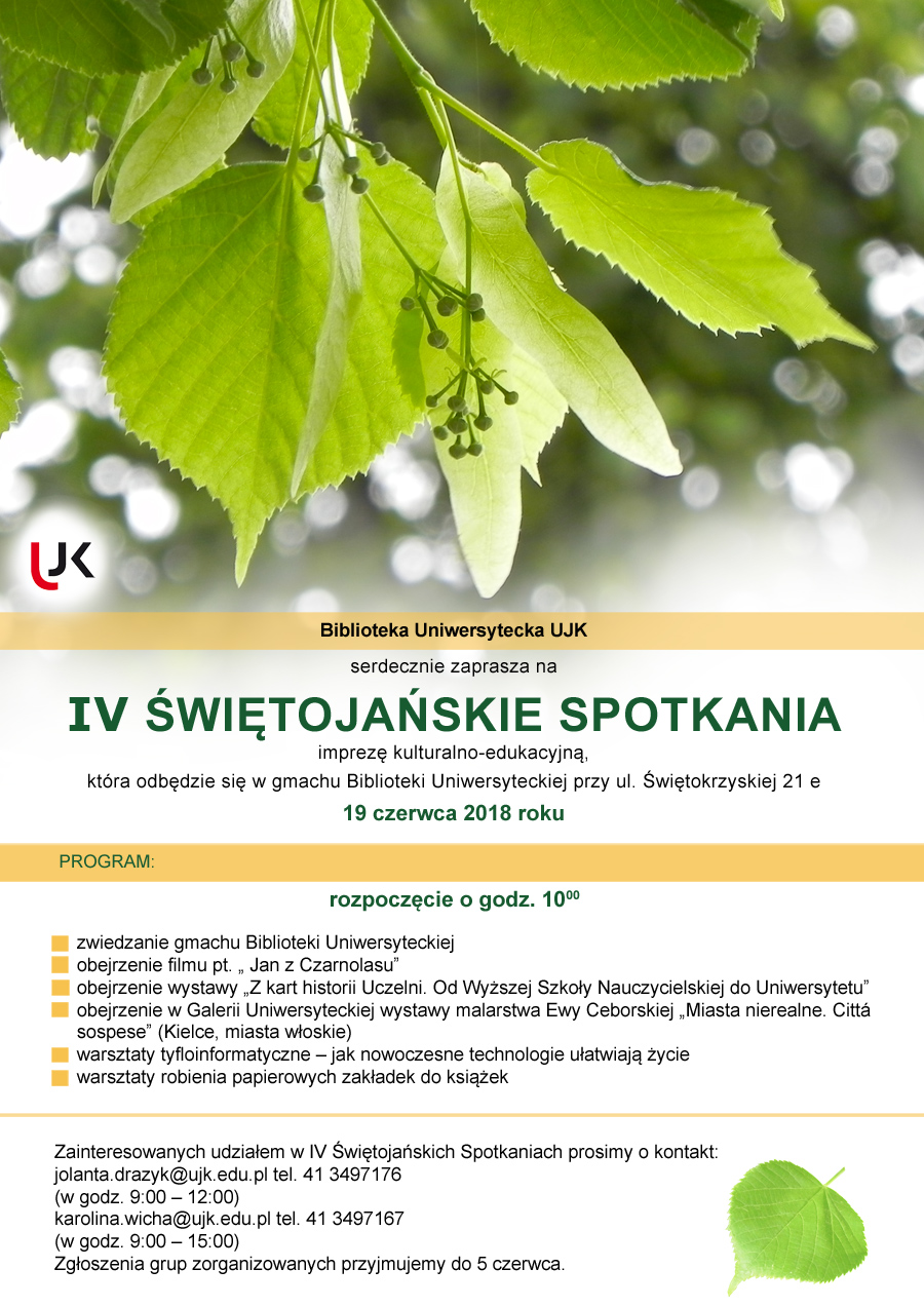 Biblioteka Uniwersytecka zaprasza wszystkich zainteresowanych do udziału w IV Świętojańskich Spotkaniach, które odbędą się 19 czerwca 2018 roku, rozpoczęcie o godzinie 10:00.