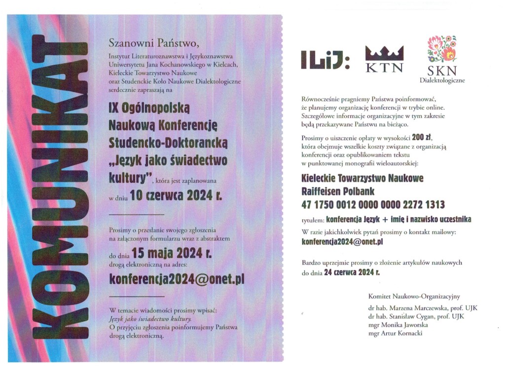 Instytut Literaturoznawstwa i Językoznawstwa Uniwersytetu Jana Kochanowskiego w Kielcach, Kieleckie Towarzystwo Naukowe, Studenckie Koło Naukowe Dialektologiczne mają zaszczyt zaprosić na IX Ogólnopolską Naukową Konferencję Studencko--Doktorancką Język jako świadectwo kultury