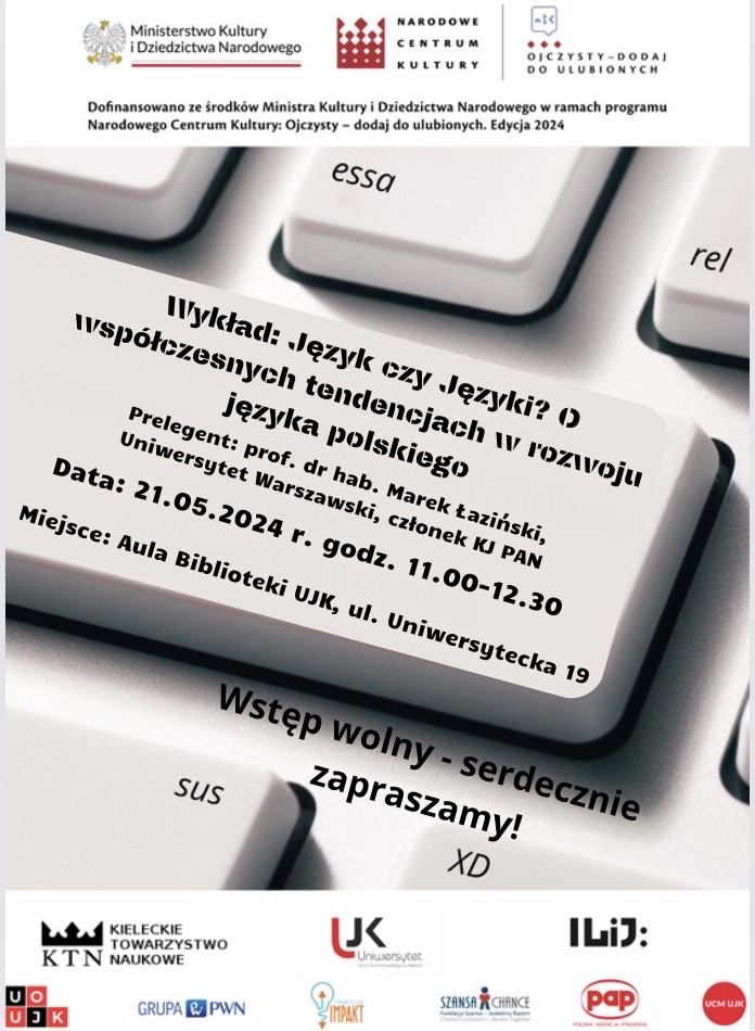 Wykład odbywa się w ramach projektu: Młode słowa i nowe trendy. Obserwatorium Języka i Kultury Młodzieży - wchodzisz i wiesz! dofinansowanego ze środków Ministra Kultury i Dziedzictwa Narodowego w ramach programu Narodowego Centrum Kultury: Ojczysty - dodaj do ulubionych. Edycja 2024.