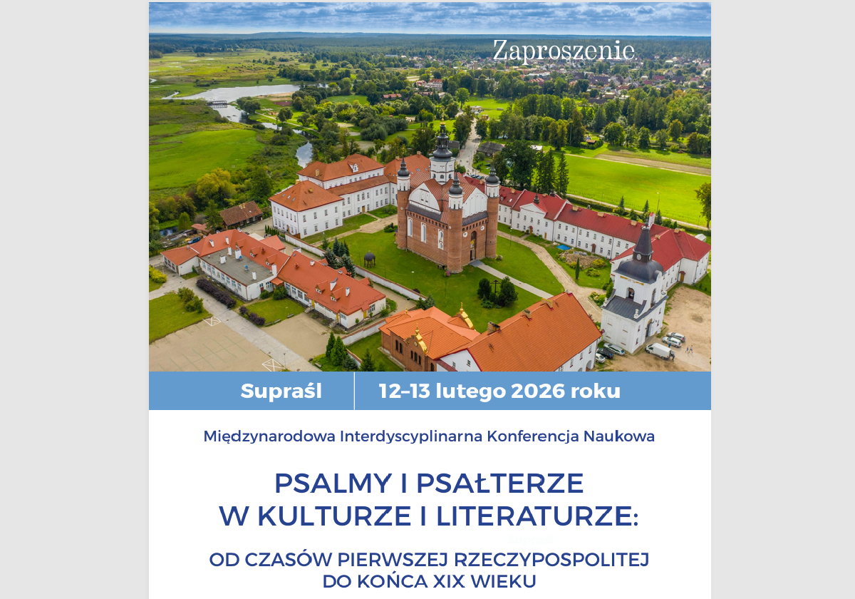 Akademia Supraska, Katedra Badań Filologicznych "Wschód-Zachód", Wydział Filologiczny Uniwersytetu w Białymstoku, Wydział I Filologiczny Polskiej Akademii Umiejętności we współpracy z Chrześcijańską Akademią Teologiczną w Warszawie, Wydziałem "Artes Liberales" Uniwersytetu Warszawskiego, Centrum "Ceraneum" Uniwersytetu Łódzkiego mają zaszczyt zaprosić na Międzynarodową Interdyscyplinarną Konferencję Naukową "Psalmy i psałterze w kulturze i literaturze: od czasów Pierwszej Rzeczypospolitej do końca XIX wieku (Supraśl 12–13 lutego 2026 roku).