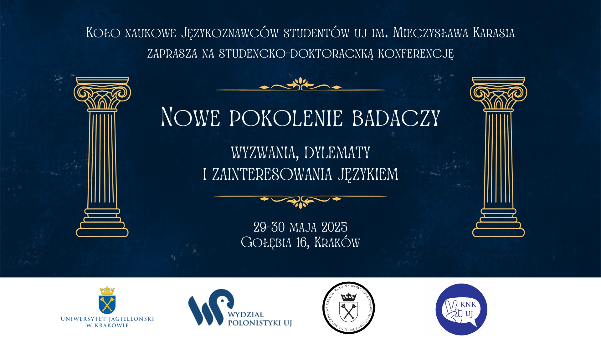 Koło Naukowe Językoznawców Studentów UJ im. Mieczysława Karasia oraz Koło Naukowe Komunikacji UJ zapraszają wszystkich zainteresowanych (studentów oraz doktorantów) do wzięcia udziału w ogólnopolskiej konferencji „Nowe pokolenie badaczy – wyzwania, dylematy i zainteresowania językiem”. Celem wydarzenia jest stworzenie przestrzeni do dyskusji oraz podzielenia się tym, co współcześnie pasjonuje młodych językoznawców. Studentów oraz doktorantów zapraszamy do zaprezentowania prowadzonych przez siebie badań, zainteresowań, a także włączenia się do dyskusji.