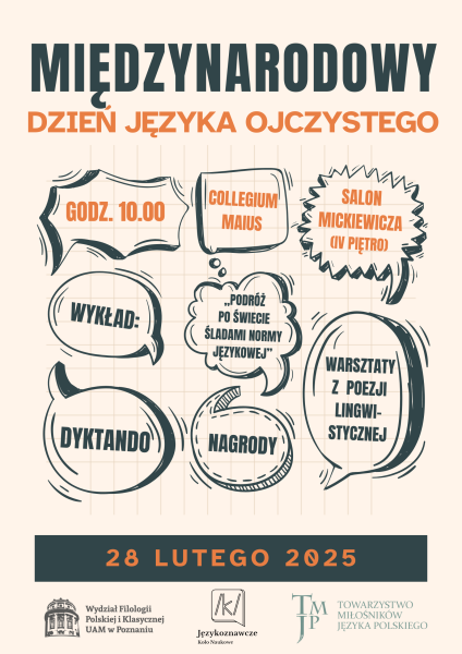 Zapraszamy serdecznie osoby studiujące na naszym Wydziale (w tym również adeptów i adeptki filologii polskiej jako obcej) do wzięcia udziału w specjalnie przygotowanych na ten dzień wydarzeniach: