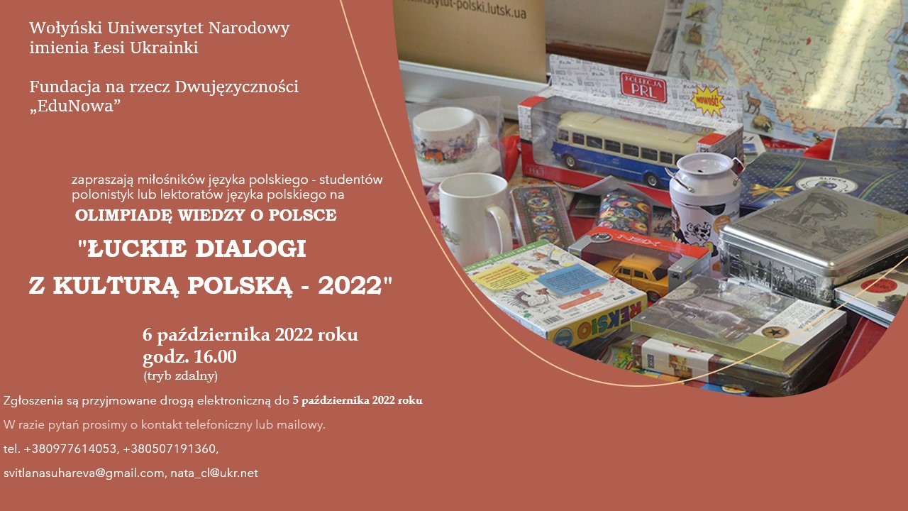 Wołyński Uniwersytet Narodowy imienia Łesi Ukrainki wspólnie z Fundacją EDUNOWA zapraszają studentów polonistyk z całej Ukrainy do udziału w IV Studenckiej Olimpiadzie Wiedzy o Polsce "Łuckie Dialogi z Kulturą Polską 2022".