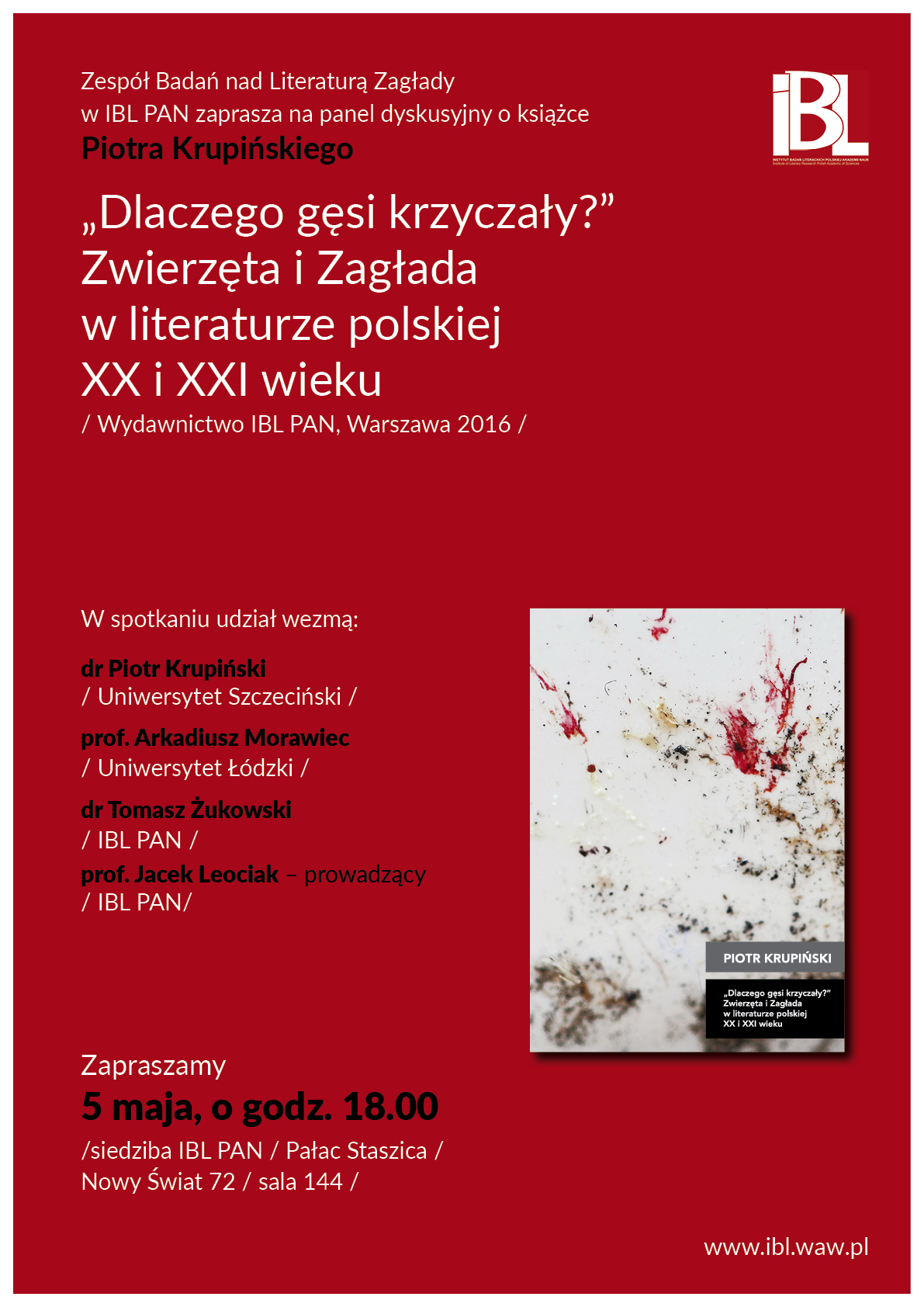 Bardzo gorąco zapraszamy Państwa do udziału w dyskusji o książkach "Realizm ekologiczny. Od ekokrytyki do zookrytyki w literaturze polskiej" Anny Barcz (Katowice, 2016) i „Dlaczego gęsi krzyczały? Zwierzęta i Zagłada w literaturze polskiej XX i XXI wieku" Piotra Krupińskiego.