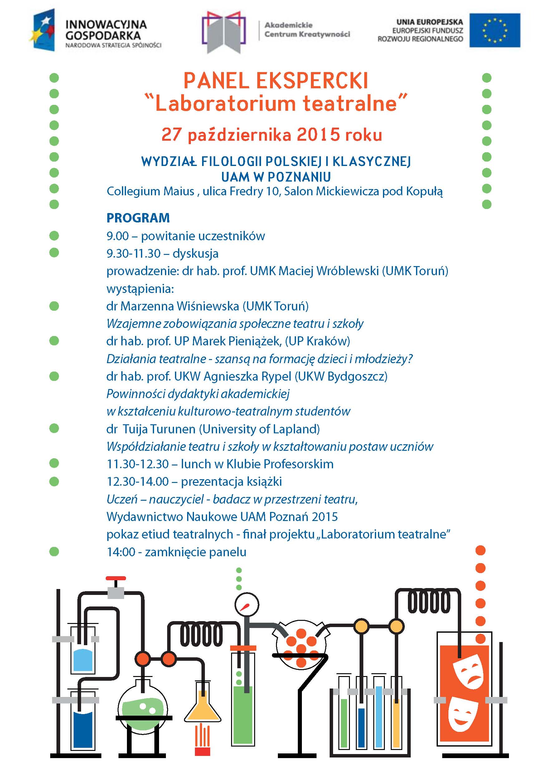 W dniu 27 października 2015 r. w poznańskim Collegium Maius (Salon Mickiewicza pod Kopułą) odbędzie się panel ekspercki podsumowujący projekt Akademickiego Centrum Kreatywności „Laboratorium teatralne” połączony z prezentacją książki „Uczeń – nauczyciel – badacz w przestrzeni teatru” oraz nagrań etiud teatralnych przygotowanych przez uczniów gimnazjum pod kierunkiem studentów WFPiK UAM. Serdecznie zapraszamy wszystkich zainteresowanych. Szczegółowy program na plakacie.