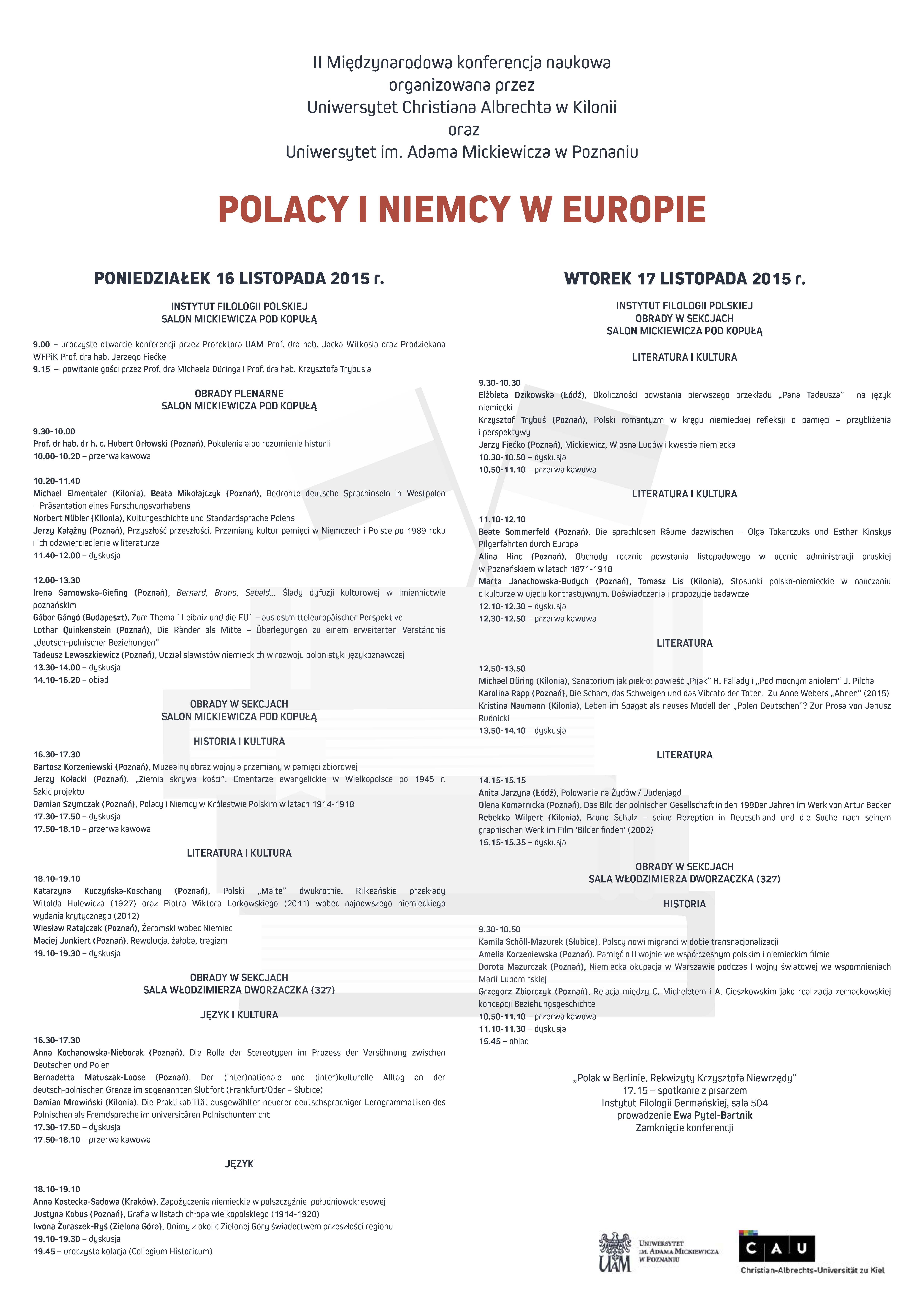 Serdecznie zapraszamy do wzięcia udziału w obradach międzynarodowej konferencji „Polacy i Niemcy w Europie”, która odbędzie się w poznańskim Collegium Maius w dniach 16–17 listopada 2015 r. Szczegóły w załączniku.