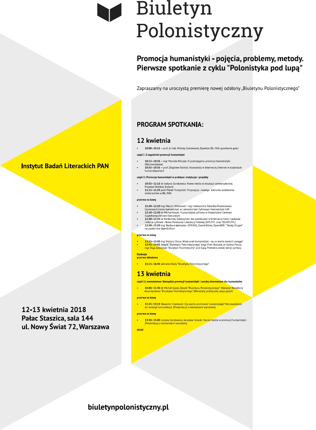 - 13:45–14:05 Zespół “Biuletynu Polonistycznego” (mgr Piotr Bordzoł, dr Sylwia Pikula, mgr Olga Zakolska): “Biuletyn Polonistyczny” pod lupą. Premiera nowej wersji portalu