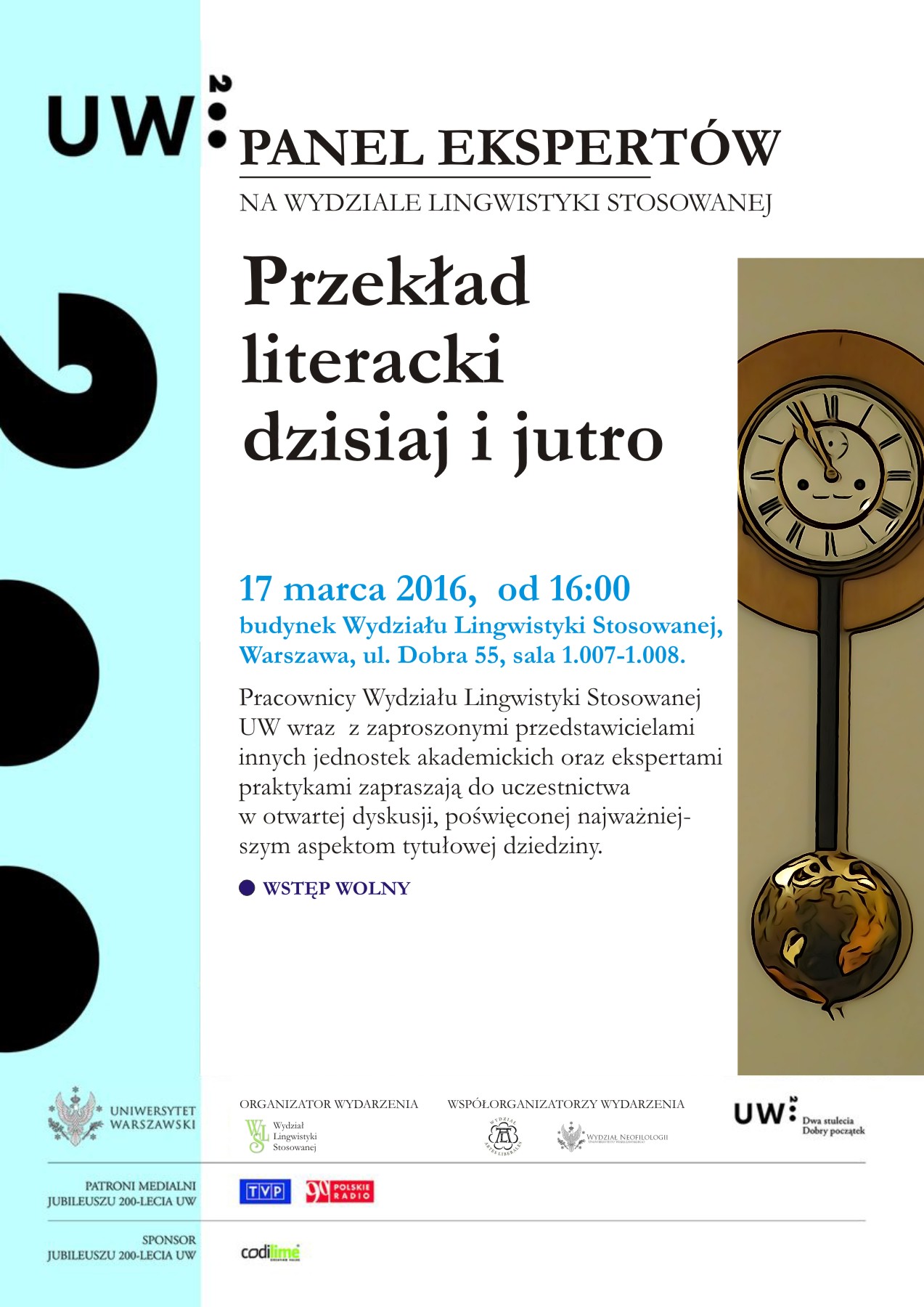 Równocześnie odbywać się będzie przekład poświęcony realiom edukacji i pracy tłumacza. Do pierwszego panelu poświęconego obecnemu stanowi dydaktyki przekładu literackiego w Polsce, a także przyszłym wyzwaniom stającym przed instytucjami prowadzącymi tego typu edukację, zaprosiliśmy m.in. prof. Elżbietę Tabakowską-Muskat (UJ), prof. Wojciecha Kubińskiego (UG) oraz prof. Olgę Kubińską (UG), a także dr Annę Kwiatkowską (UWM) i dr Annę Fornalczyk (WLS UW). W roli moderatora zgodziła się wystąpić prof. Aniela Korzeniowska (IA UW).