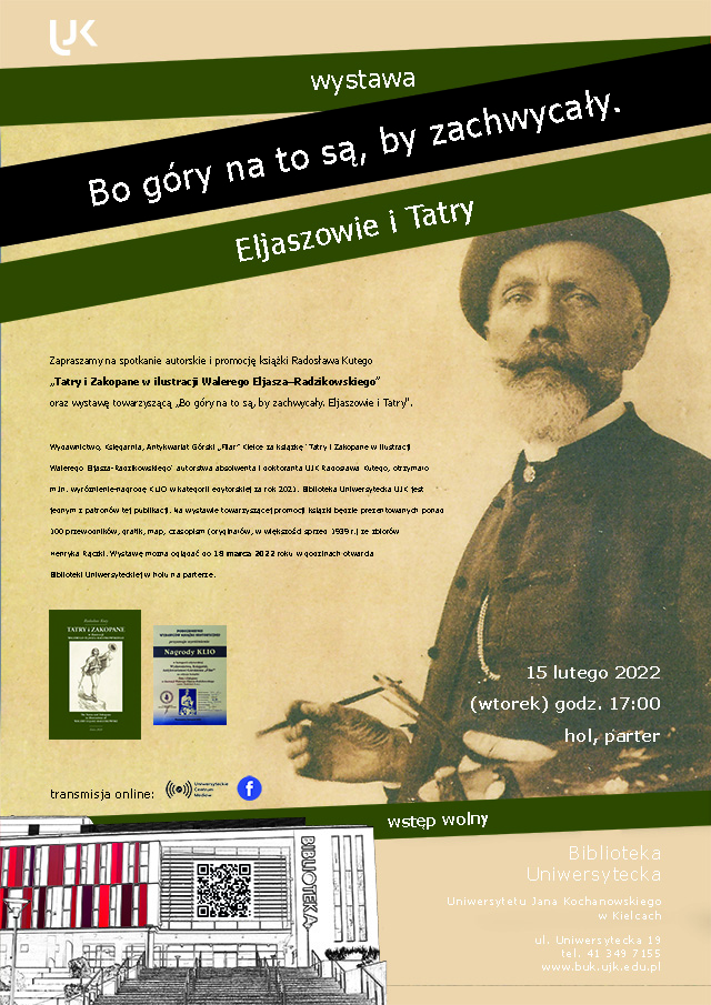Dyrektor Biblioteki Uniwersyteckiej serdecznie zaprasza na spotkanie autorskie dotyczące promocji książki „Tatry i Zakopane w ilustracji Walerego Eljasza–Radzikowskiego" Radosława Kutego oraz towarzyszącą mu wystawę „Bo góry na to są, by zachwycały. Eljaszowie i Tatry".