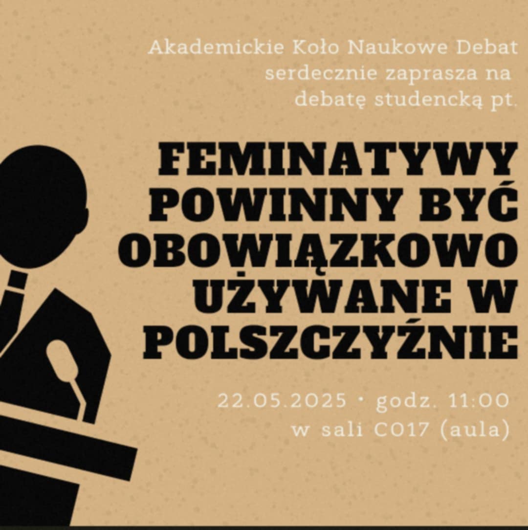 Akademickie Koło Naukowe Debat w Akademii Tarnowskiej serdecznie zaprasza wszystkich zainteresowanych na pierwszą debatę Feminatywy w polszczyźnie powinny być obowiązkowe. Po debacie gościnie: dr hab. Małgorzata Pachowicz, prof. AT (językoznawczyni), dr Wanda Kulesza, prof. AT (pedagożka), dr Ewelina Suszek (literaturoznawczyni i filozofka, Pełnomocniczka Rektora AT ds. Równości) i lic. Nikola Rolewicz (studentka filologii polskiej) porozmawiają o feminatywach w realiach szkoły wyższej.