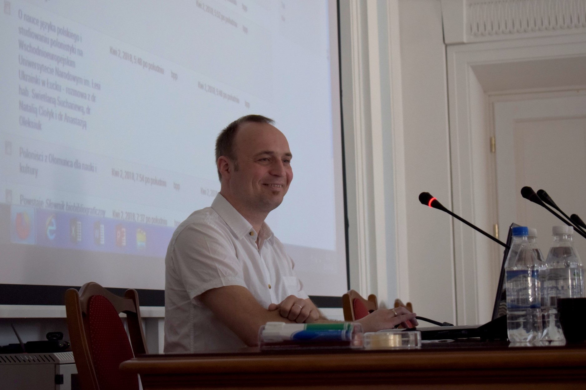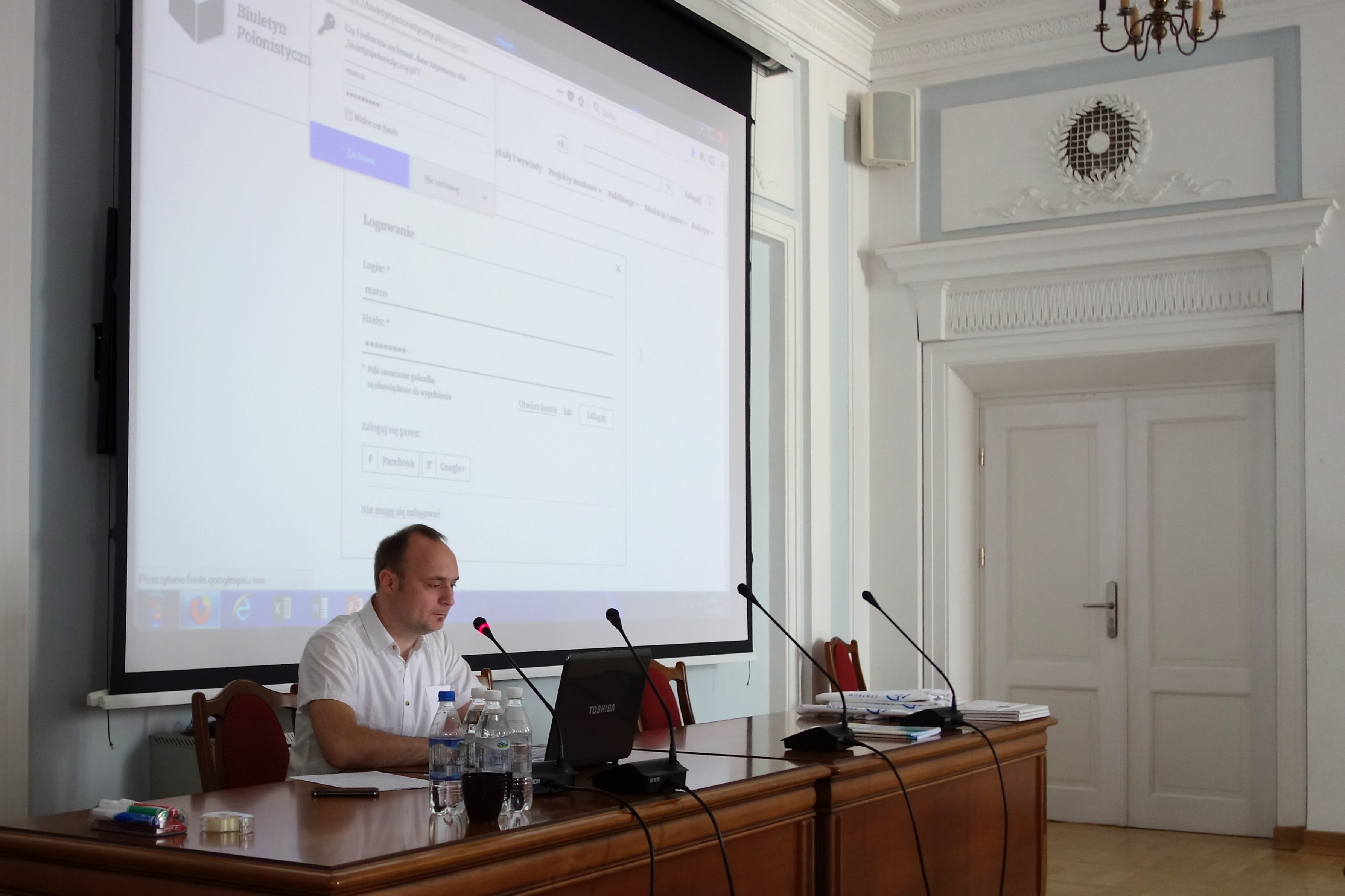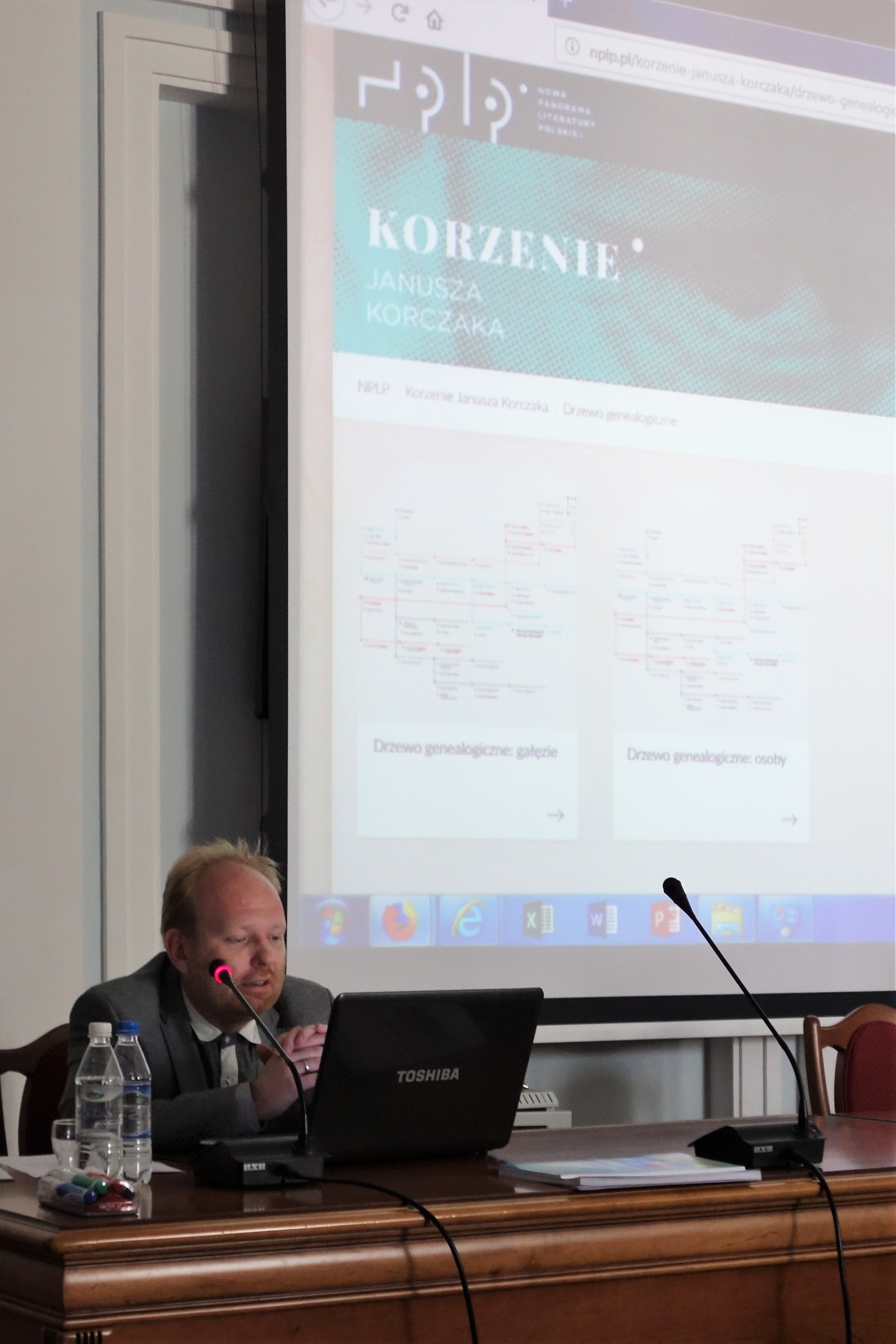 Następnie głos zabrał dr Bartłomiej Szleszyński, którego wystąpienie dotyczyło m.in. sposobów publikowania treści naukowych w Internecie. Na przykładzie realizowanych projektów – Nowej Panoramy Literatury Polskiej oraz Korzenie Janusza Korczaka pokazał wagę odchodzenia od modelu encyklopedii w prezentacji badań polonistycznych, rolę grafiki i strony wizualnej oraz zmianę sposobu myślenia, w którym nie chodzi o samo przeniesienie treści, ale o funkcjonalne wykorzystanie narzędzi cyfrowych, w tym możliwości linkowania i przeszukiwania baz danych.