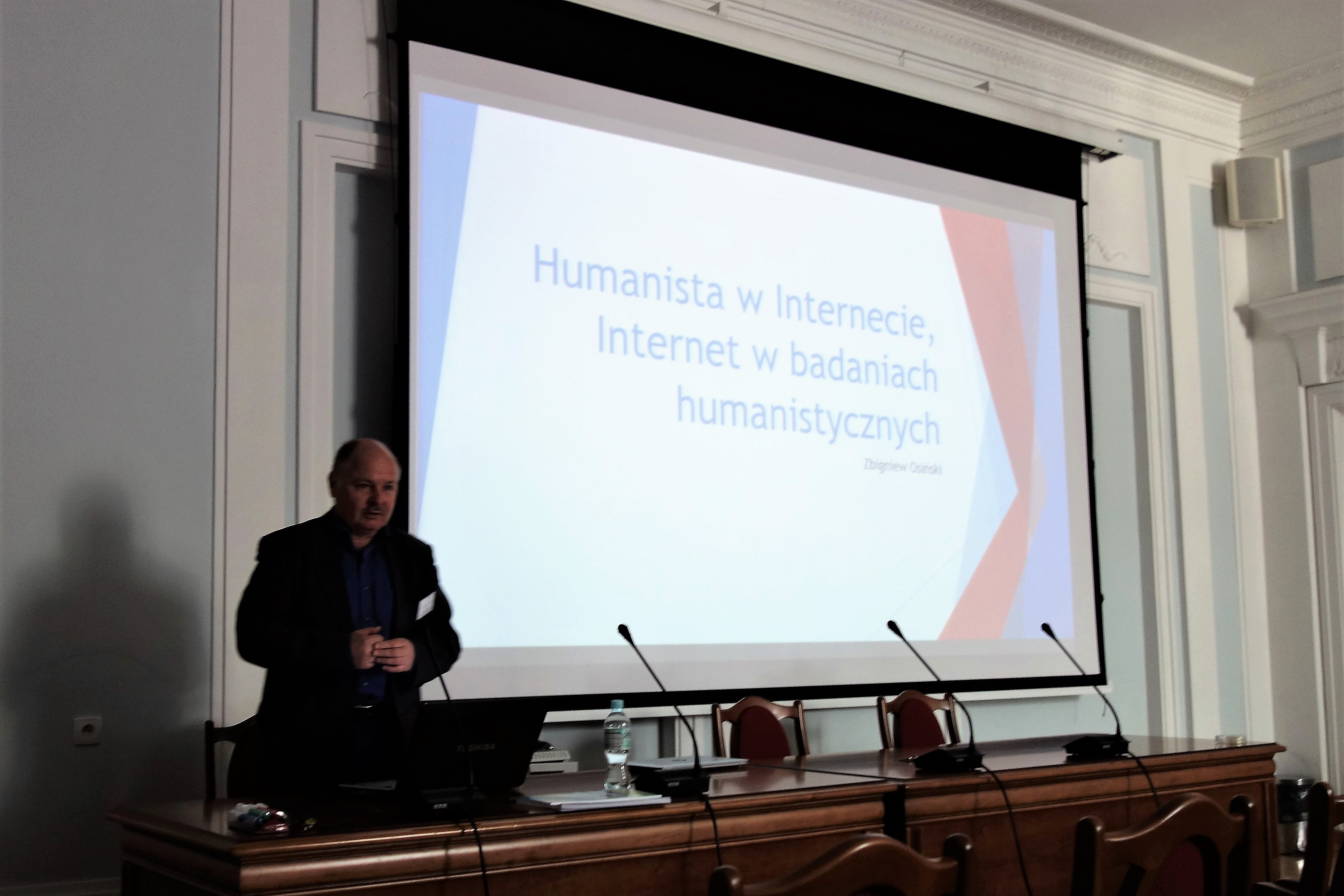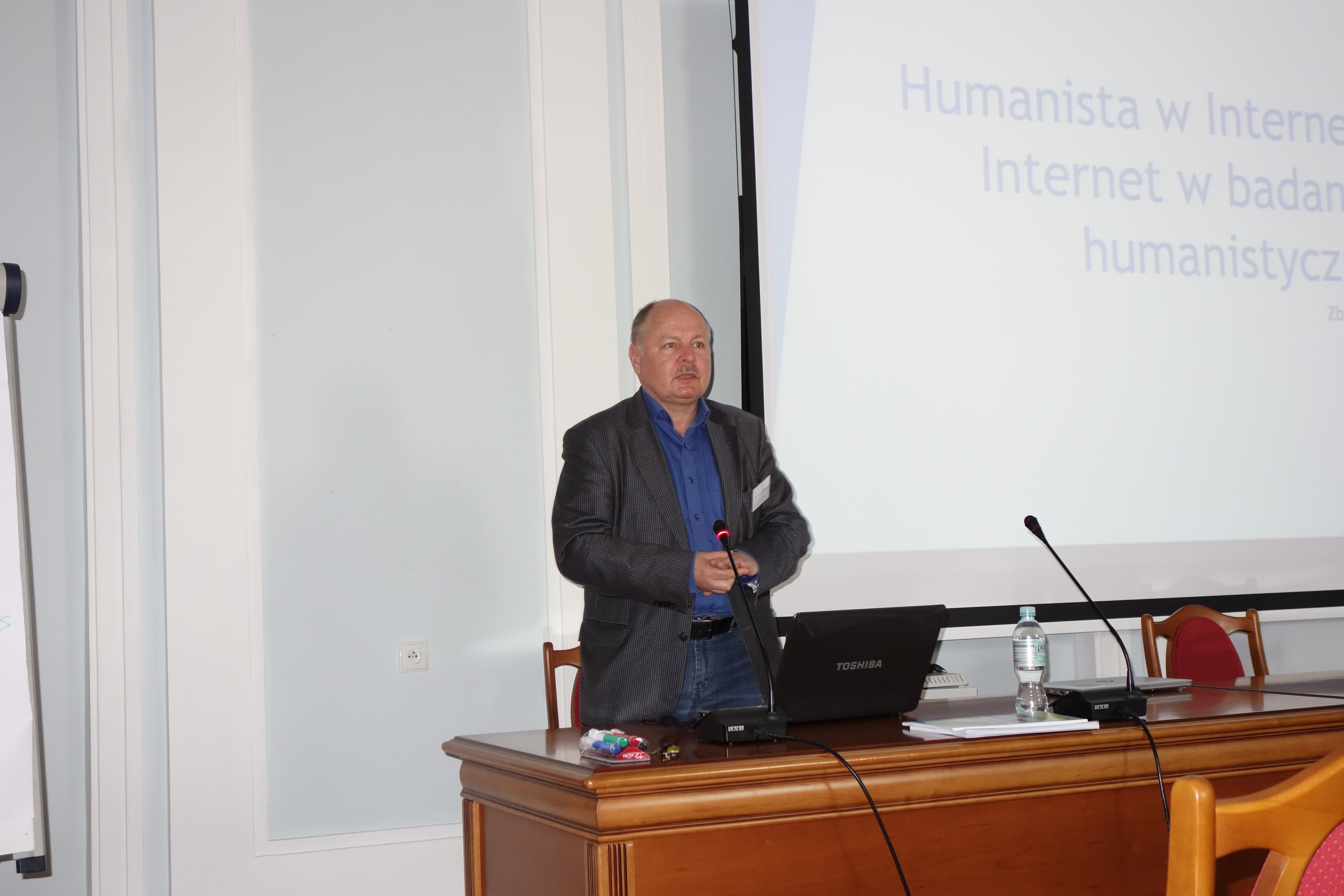 Kolejny referat wygłosił Profesor Zbigniew Osiński, który dokonał prezentacji schematu infrastruktury informacyjnej humanistyki, obejmujące źródła informacji bibliograficznej; źródła wiedzy naukowej, a także narzędzia zapewniające pozyskiwanie i dostęp do elektronicznych źródeł wiedzy, następnie narzędzia do komunikacji naukowej oraz narzędzia badawcze. Prelegent przedstawił prognozy zmian w postrzeganiu i uprawianiu nauki, które mogą wynikać z upowszechniania narzędzi cyfrowych. Podkreślił wzrost liczby prac naukowych w formie wizualizacji lub z przewagą wizualizacji nad tekstem. Owocem tych tendencji jest powstawanie książek z równolegle wydawaną wersją cyfrową i innymi dodatkami w formie elektronicznej, publikowanie cyfrowych opowieści, podejmowanie zagadnień o charakterze interdyscyplinarnym, badanie i przetwarzanie dużych zbiorów danych. Na zakończenie prelegent zwrócił uwagę na zalety wykorzystywania narzędzi cyfrowych w publikowaniu i popularyzacji treści naukowych.