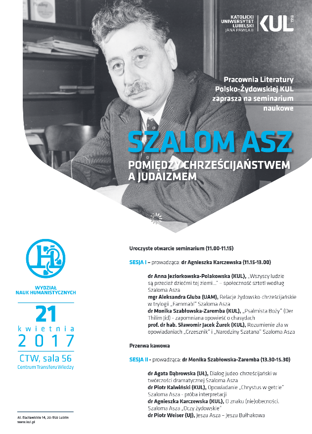 Pracownia Literatury Polsko-Żydowskiej KUL zaprasza na seminarium naukowe Szalom Asz. Pomiędzy chrześcijaństwem a judaizmem. 21 kwietnia 2017, Katolicki Uniwersytet Lubelski Jana Pawła II, Lublin, Al. Racławickie 14, Centrum Transferu Wiedzy KUL, sala 56