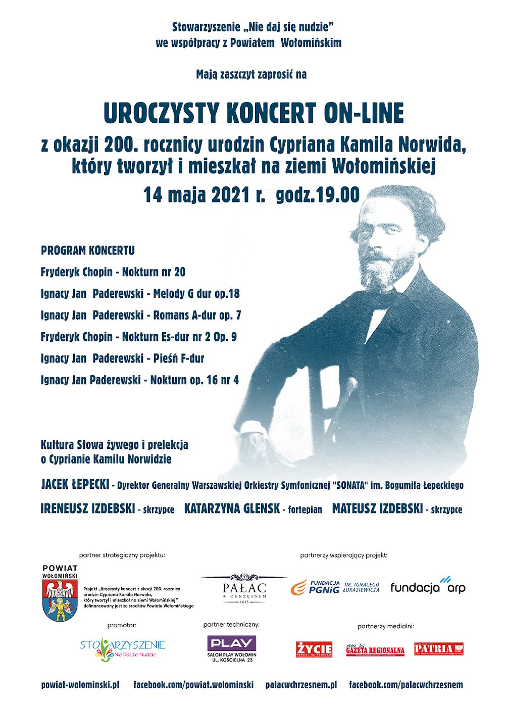 "Uroczysty koncert z okazji 200. rocznicy urodzin Cypriana Kamila Norwida, który tworzył i mieszkał na ziemi wołomińskiej".