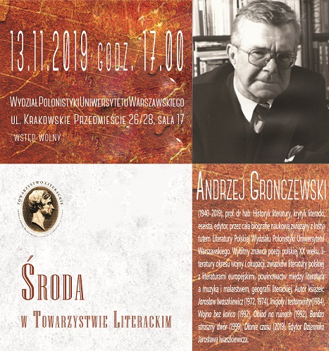 Warszawski Oddział Towarzystwa Literackiego im. Adama Mickiewicza oraz Instytut Literatury Polskiej UW zapraszają na "Wieczór wspomnieniowy wokół książki Andrzeja Gronczewskiego Dłonie czasu", który odbędzie się w ramach cyklu Śród w Towarzystwie Literackim.