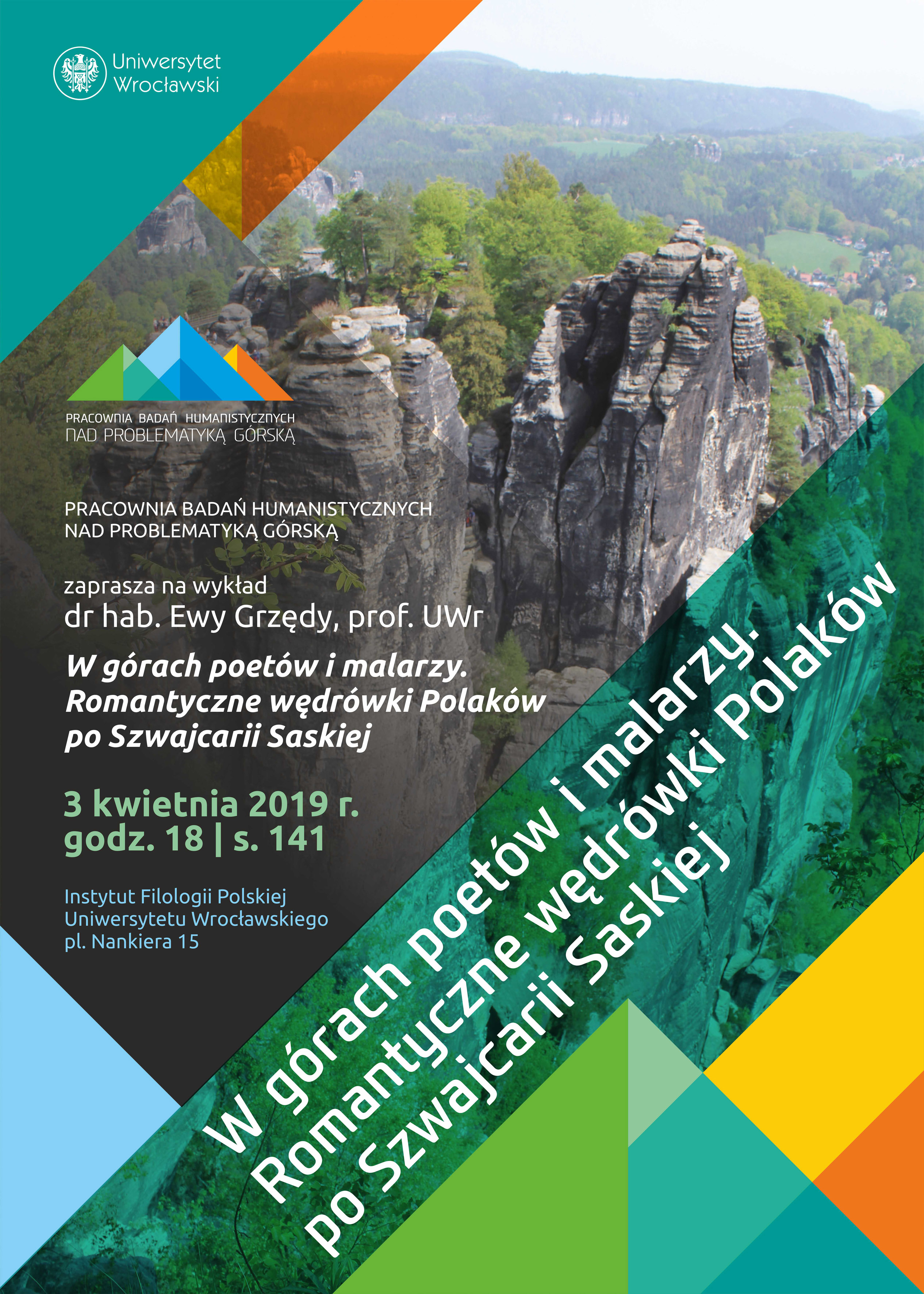 3 kwietnia 2019 r. o godz. 18.00 w sali 141 Instytutu Filologii Polskiej UWr (pl. Nankiera 15) odbędzie się kolejny wykład otwarty organizowany przez Pracownię Badań Humanistycznych nad Problematyką Górską IFP UWr. Wykład zatytułowany "W górach poetów i malarzy. Romantyczne wędrówki Polaków po Szwajcarii Saskiej" wygłosi dr hab. Ewa Grzęda Prof UWr.
