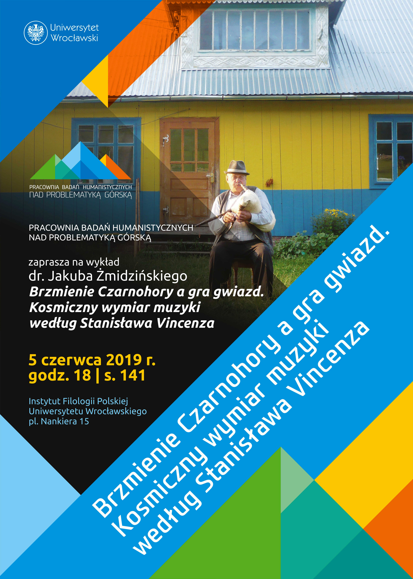 Pracownia Badań Humanistycznych w Instytucie Filologii Polskiej Uniwersytetu Wrocławskiego zaprasza na wykład otwarty dra Jakuba Żmidzińskiego „Brzmienie Czarnohory a gra gwiazd. Kosmiczny wymiar muzyki według Stanisława Vincenza”, który odbędzie się 5 czerwca 2019 r. o godz.18.00 (pl. Nankiera 15, sala 141).