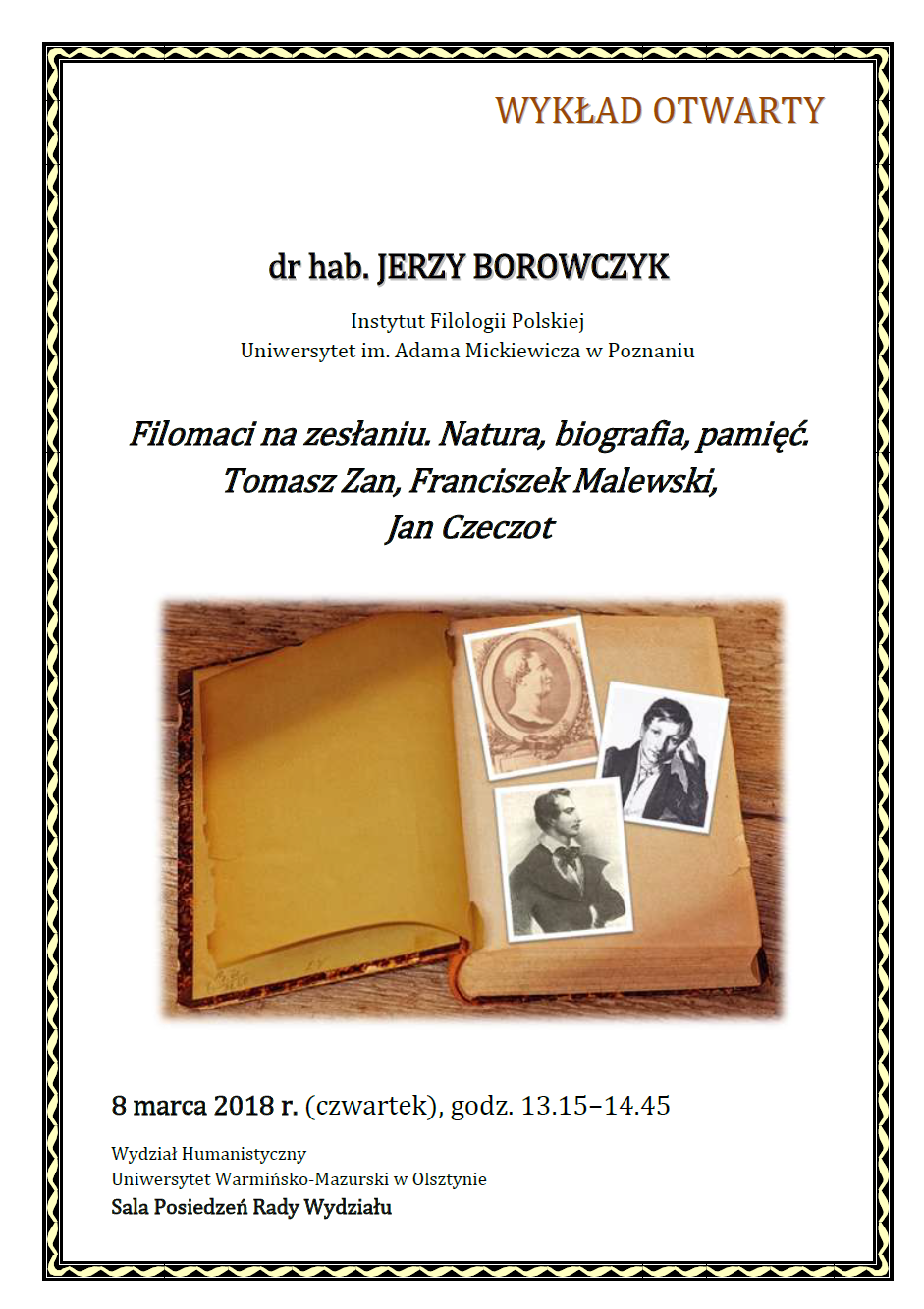 Serdecznie zapraszamy na wykład otwarty pt. „Filomaci na zesłaniu. Natura, biografia, pamięć. Tomasz Zan, Franciszek Malewski, Jan Czeczot”, który odbędzie się 8 marca br. (czwartek) w godz. 13.15–14.45 w Sali Posiedzeń Rady Wydziału/ (107A). Wykład poprowadzi dr hab. Jerzy Borowczyk, pracownik Instytutu Filologii Polskiej Uniwersytetu im. Adama Mickiewicza w Poznaniu.