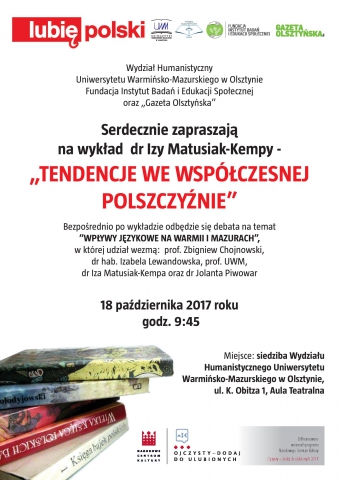 Serdecznie zapraszamy na wykład dr Izy Matusiak-Kempy pt. "Tendencje we współczesnej polszczyźnie" oraz debatę na temat "Wpływy językowe na Warmii i Mazurach", które odbędą się 18 października 2017 roku o godz. 9.45 w Auli Teatralnej Wydziału Humanistycznego UWM.