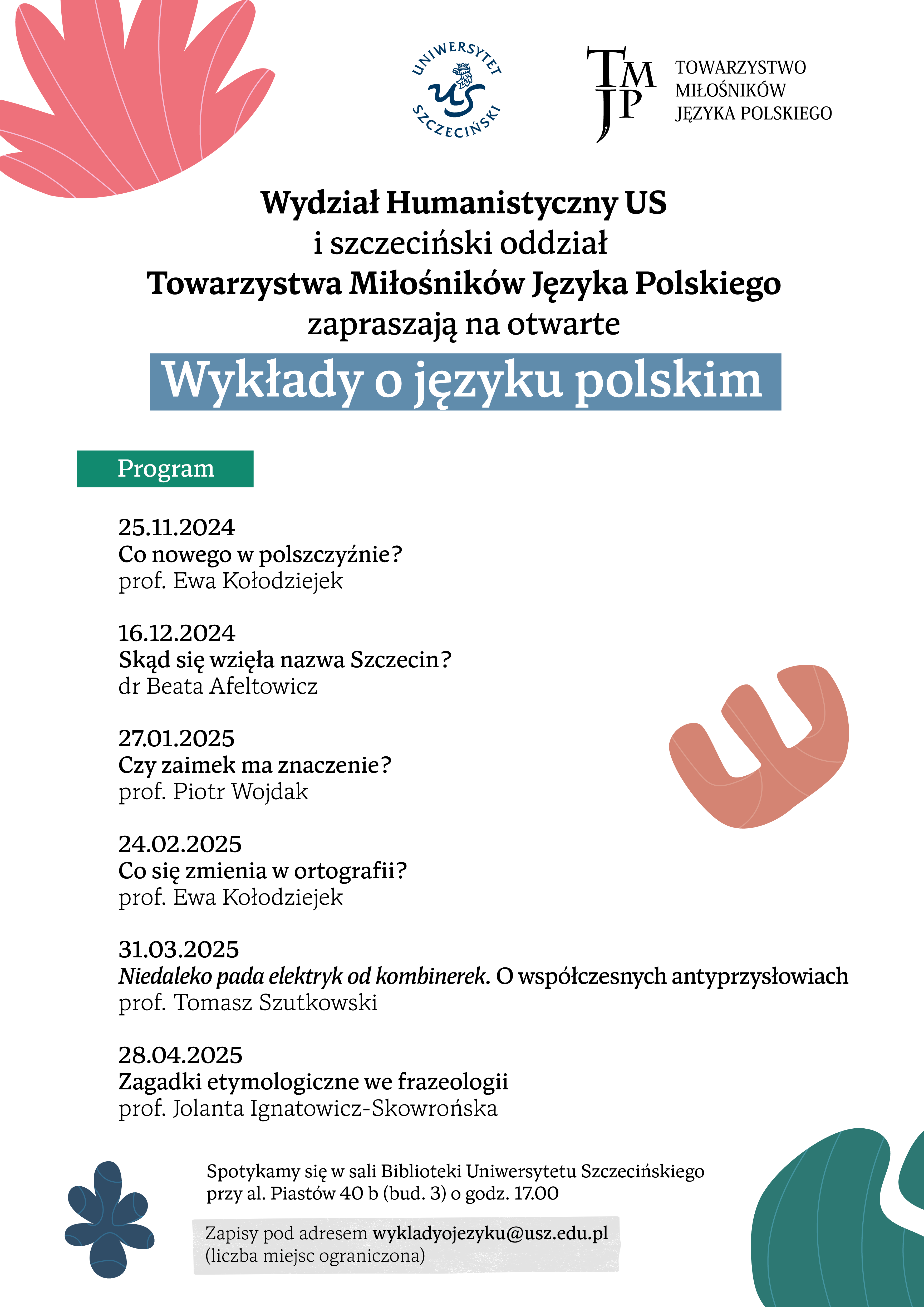 Wydział Humanistyczny Uniwersytetu Szczecińskiego i szczeciński oddział Towarzystwa Miłośników Języka Polskiego zapraszają na Wykłady o języku polskim.