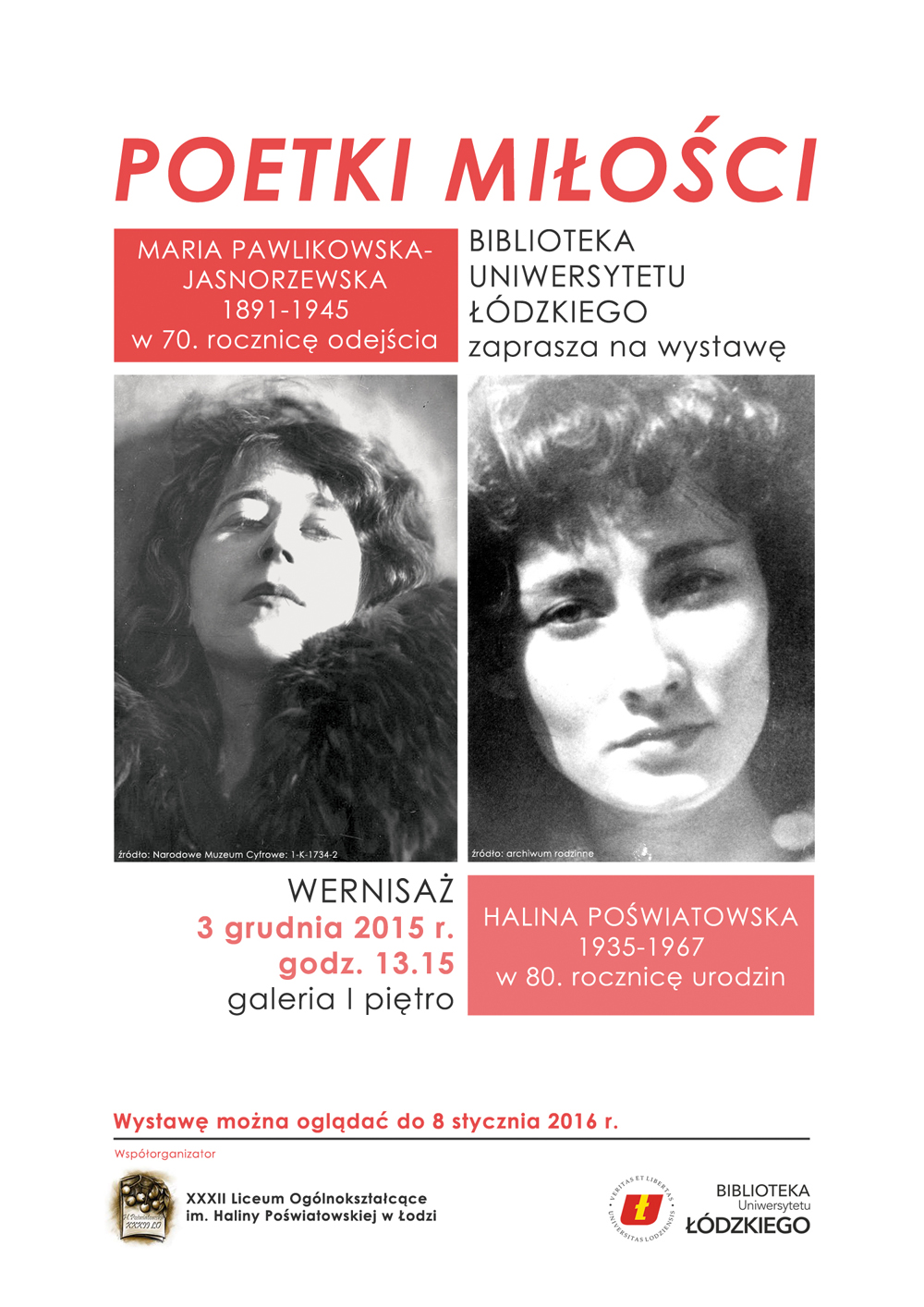 3 grudnia br. odbył się wernisaż "Poetki miłości" poświęcony Damom Poezji. Organizatorami wydarzenia byli: BUŁ i XXXII Liceum Ogólnokształcące im. H. Poświatowskiej w Łodzi. Wernisaż swoją obecnością uświetnili: brat Haliny Poświatowskiej, Pan Zbigniew Myga z małżonką, dr Dominika Dworakowska z Zakładu Dydaktyki Języka i Literatury Polskiej Wydziału Filologicznego UŁ, która wygłosiła referat "O liryce miłosnej Marii Pawlikowskiej-Jasnorzewskiej i Haliny Poświatowskiej raz jeszcze" oraz dyrekcja i uczniowie z XXXII LO im. Haliny Poświatowskiej w Łodzi.