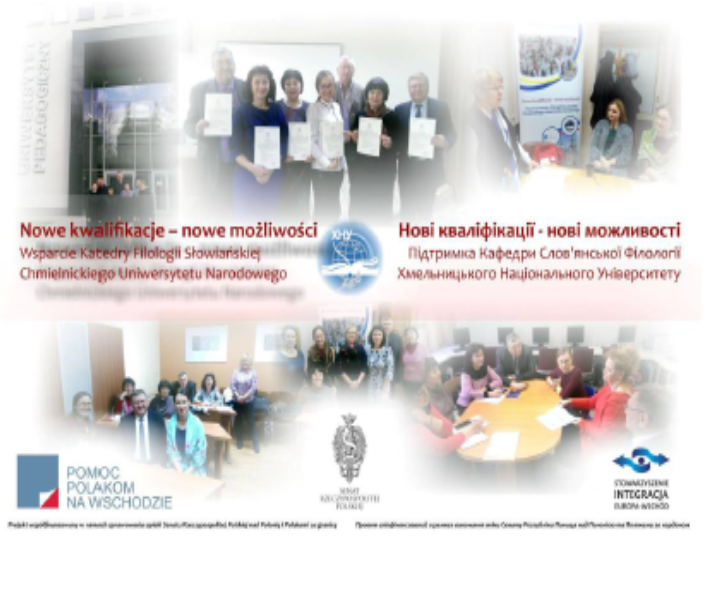 - „Nowe kwalifikacje – nowe możliwości” – wsparcie Katedry Slawistyki na Uniwersytecie Chmielnickim, współfinansowany przez Fundację Pomoc Polakom na Wschodzie w ramach opieki Senatu RP nad Polonią i Polakami za granicą. Projekt został zrealizowany wspólnie z Uniwersytetem Pedagogicznym im. Komisji Edukacji Narodowej w Krakowie oraz ze Stowarzyszeniem „Integracja Europa-Wschód" (Kielce, Polska) w latach 2017 i 2018;
